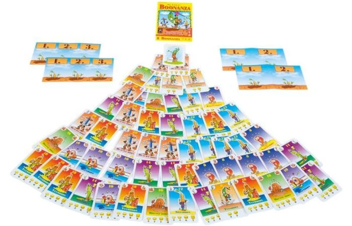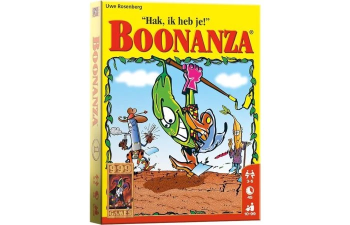 In dit communicatieve kaartspel handelen de spelers met hun bonen en verbouwen deze op hun akkers. Wie troggelt de andere spelers de beste bonen af en verdient het meeste geld? Iedere speler krijgt 5 bonenkaarten en moet deze op volgorde in zijn hand houden. Verder heeft hij twee bonenvelden, waarop hij bonen verbouwt. Als je aan de beurt bent, moet je één of twee kaarten uit je hand verbouwen. Daarna mag je met de andere spelers handelen. Als je genoeg bonen op een veld verzamelt, kun je deze voor goed geld verkopen. Maar omdat je soms een soort moet verbouwen die niet op jouw veld past, kan het gebeuren dat je de boel voor weinig geld weg moet doen… Boonanza is een fascinerend handelsspel van de auteur van Agricola en Le Havre en is een echte aanrader voor liefhebbers van bijvoorbeeld De Kolonisten van Catan.