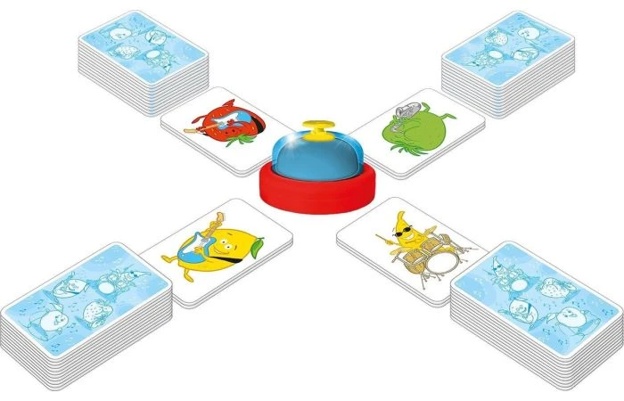 Het fruit speelt in dit spel op een muziekinstrument. Draai steeds een kaart om en bel als je 2 kaarten ziet die 2 gelijke eigenschappen hebben. Daarbij kan het gaan om gelijke kleuren, gelijke instrumenten of gelijke vruchten. Wie wint de meeste kaarten?
