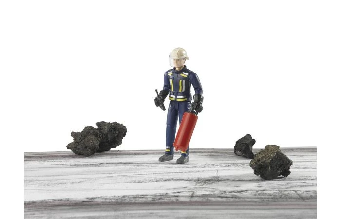 De brandweerman is onmiddellijk klaar voor gebruik dankzij zijn beschermende kleding en uitrusting bestaande uit uniform, helm met vizier en handschoenen. Hij heeft altijd een brandblusser bij zich die hij snel kan gebruiken om te voorkomen dat een brand zich verspreidt. Als de brandweerman de brand zelf niet aankan, dan kan hij om versterking bellen op zijn radio. BRUDER Spielwaren beschikt over diverse voertuigen en extra’s om een grote brandweerprocedure te kunnen nabootsen.