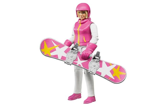 Deze Bruder BWorld snowboarder draagt een complete snowboard uitrusting met een witte broek en sweater een een bodywarmer, handschoenen en helm in de kleur roze. Inclusief bijpassend snowboard. Hierdoor is de vrouw direct klaar om een mooie piste te nemen tijdens de wintersportvakantie.