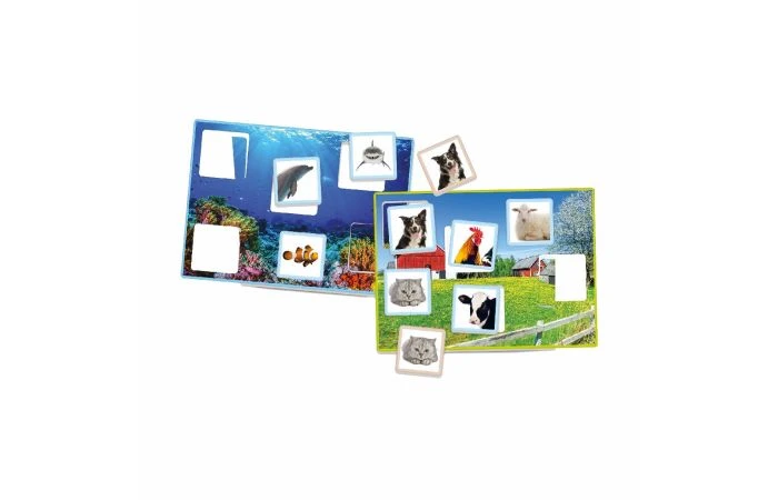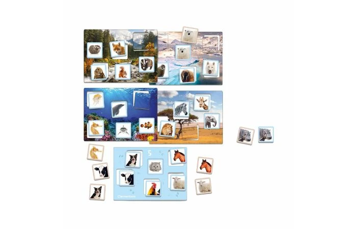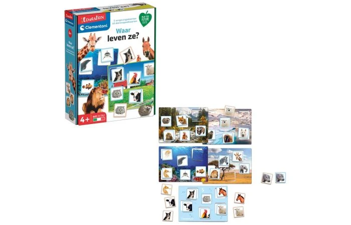 Clementoni leerspel Waar leven ze? Dit leuke bordspel combineert het klassieke bingo met een ontdekkingstocht naar de fascinerende dierenwereld. De bladen zijn verdeeld in thema’s op basis van de leefomgeving van de dieren. Kinderen kunnen ze samenstellen en personaliseren door hun favoriete dieren toe te voegen. Het spel stimuleert de observatie- en associatievaardigheden en laat het kind kennismaken met de dierenwereld. Geschikt voor kinderen vanaf 4 jaar.