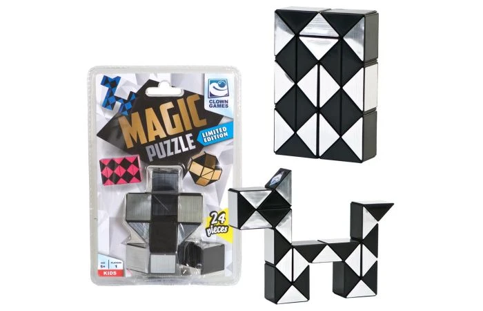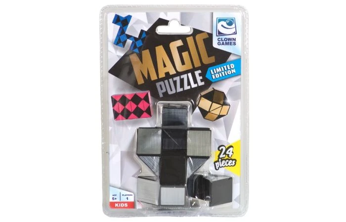 Met deze coole Magic puzzel kun je van alles maken. Nu ook in zilver beschikbaar! Een hondje, een cirkel of een cobra… gebruik jouw fantasie! De Clown Magic Puzzle bestaat uit 24 draaibare elementen. Geschikt voor kinderen vanaf 5 jaar.