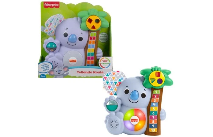 Terwijl baby’s met hun vriendje de koala in een palmboom klimmen, komen ze tot een verrassende ontdekking: aan deze boom groeien vierkanten, driehoeken en cirkels. De Linkimals Tellende Koala van Fisher-Price is een muzikaal educatief vriendje voor baby’s, met spannende lichtjes, liedjes en zinnetjes over cijfers, tellen en vormen. En wanneer de tellende koala andere Linkimals vriendjes ontmoet, gaan ze samen praten, zingen, spelen en licht geven! Actief speelplezier met een rollerbal om tegen te tikken, een vormenspinner en drukknoppen. De fijnmotorische vaardigheden van je baby worden versterkt, terwijl de spannende interactieve content oorzaak en gevolg duidelijk maakt. Wordt inclusief 3 AA-batterijen geleverd in try-me verpakking. Voor kinderen vanaf 9 maanden.