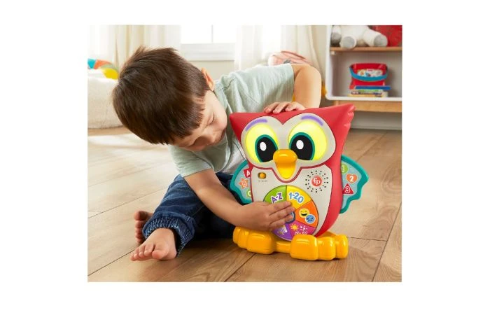 Speeltijd is een echte giller met de Fisher Price Wijze Ogen Uil. Terwijl peuters op de knoppen op de buik van Uil drukken en hem heen en weer wiegen, licht deze expressieve vriend op met felle kleuren en meer dan 90 liedjes, geluiden en zinnen om het alfabet te leren, tellen 1-20, het weer, emoties en meer. Wanneer de Uil andere vrienden ontmoet, lichten ze op, praten, zingen en spelen ze samen!
