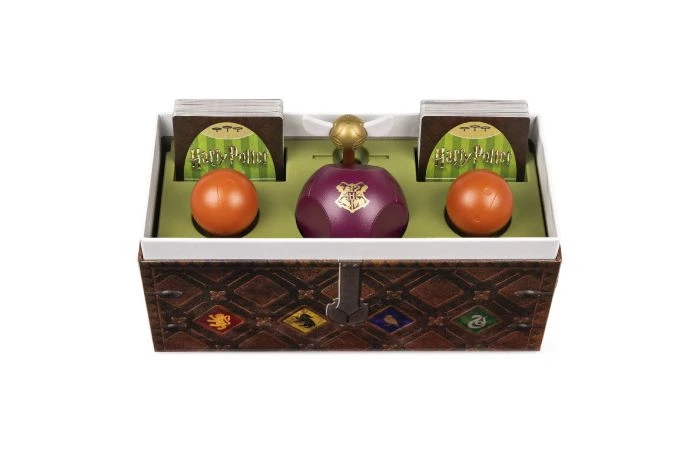 Haal de snelheid en opwinding van een echte Zwerkbalwedstrijd bij je thuis met Vang De Gouden Snaai, een Zwerkbalspel voor heksen, tovenaars en dreuzels. Iedereen speelt tegelijkertijd terwijl de kaarten snel van speler naar speler worden doorgegeven, waarbij iedereen probeert sets te bouwen en punten te verdienen. In het midden van de actie ligt een open Zwerkbalkist, met een Slurk, twee Beukers en het allerbelangrijkste, de Gouden Snaai. Wanneer je bepaalde kaarten neerlegt, komen deze magische items tevoorschijn om te spelen! De actie gaat sneller dan een Nimbus 2000 als kaarten van hand wisselen, sets op tafel komen en Beukers hun doel bereiken. Wanneer de Gouden Snaai vanuit de kist de lucht in schiet, grijp hem dan! Het spel eindigt wanneer de Gouden Snaai gevangen wordt: de speler met de meeste punten wint. Geschikt voor 3 tot 4 spelers vanaf 8 jaar.