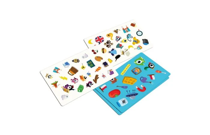 Wie is de snelste? In dit spel gaat het erom dat je zo snel mogelijk ziet welk voorwerp twee keer op de kaart staat! Alle spelers doen mee, dus je moet echt vliegensvlug zijn! Op elke kaart staan ook twee dezelfde voorwerpen met allebei een andere kleur, ben je nu nog steeds de snelste? Daarnaast staan op elke kaart nog twee voorwerpen die met elkaar te maken hebben, zoals een zon en een maan of een hamer en een zaag. Zie jij het verband en ben jij nu ook weer de snelste?