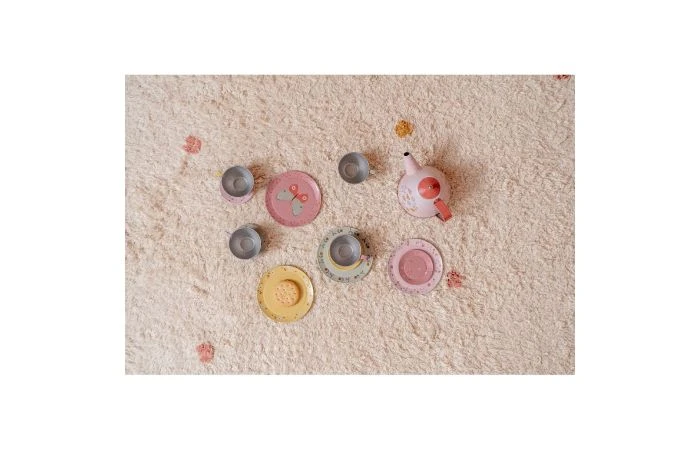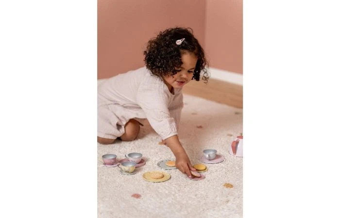 Zullen we samen theedrinken? Met dit schattige tinnen theeservies speelt je kind een geweldig rollenspel. Dit theesetje versierd met bloemen en vlinders prikkelt de fantasie van kinderen en stimuleert de fijne motoriek. De set bestaat uit vier kleine theekopjes, vier schoteltjes, vier gebaksbordjes en een theepot met deksel. Let op: berg het product na gebruik droog op. Geschikt voor kinderen vanaf 36 maanden.