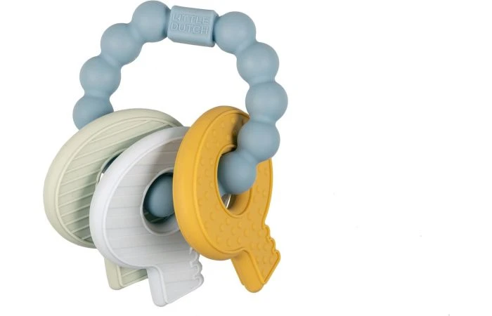 De komst van de eerste tandjes is een mijlpunt voor jouw baby, maar niet altijd even prettig! Om de pijn te verlichten heeft Little Dutch een multifunctionele bijtring ontworpen in de vorm van een sleutelbos. Het is een speeltje maar biedt ook troost en helpt de nieuwe tandjes door te komen. Het bijtspeeltje heeft verschillende texturen waardoor jouw baby genoeg te ontdekken heeft. Speciaal ontworpen dat het makkelijk vast te pakken is voor baby handjes! In zachte tinten blauw, zand en groen. Geschikt voor kinderen vanaf 4 maanden.