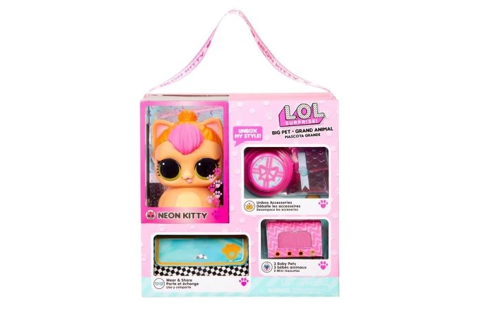 LOL Surprise Big Neon Kitty met 15 verrassingen inclusief bril om te dragen en delen, halsketting en dierenbaby’s. O, nee! De LOL Surprise-poppen waren op een topgeheime missie toen hun diertje verdween! Pak 15 verrassingen uit met LOL Surprise Big Pet Neon Kitty, inclusief dierendraagmand met 2 dierenbaby’s en 1 dierenbabybedeltje of voedselbabybedeltje erin. Wat ga jij vinden? Zoek bovendien in de Eye Spy-serie naar verrassende aanwijzingen om hun dier te vinden! L.O.L. Surprise! Big Pets bevatten talloze verrassingen binnenin en zijn inclusief dragen-en-delen-accessoires voor jou! Zet de spionagebril uit de Eye Spy-serie op om codes te vinden en verrassingen te ontgrendelen en deel dan je bril met je Big Pet! Haar halsketting wordt een armband voor jou! Inclusief 1 vorkbeen, 1 telefoonbotje, 1 waarzeggershart, 1 baby om te onthullen. Je kunt Neon Kitty als een rugzak dragen of gebruiken als een spaarvarken. Er zit ook een draagtasje bij. Verzamel ze allemaal! Wordt geleverd in windowbox met leuk handvat.