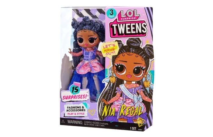 Maak kennis met de populaire LOL Surprise Tween-modepoppen van serie 3: hallo, Nia Regal! Nia heeft grote dromen: ze wil toonaangevend zijn en is al goed op weg. Van klassenoudste tot de koningin van haar groepje, Nia is klaar om op het podium te schitteren. Bovendien is ze de grote zus van de LOL Surprise-pop Her Majesty. Pak 15 verrassingen uit, waaronder een Tweens-modepop, met een supermooi gezichtje, prachtig haar en haar eigen fantastische stijl. Elke doos is inclusief een LOL Surprise Tweens-modepop, een fenomenale outfit, accessoires, een haarborstel en een poppenstandaard. Deze LOL Surprise-modepoppen met stijlvol haar, outfits en veel accessoires met allerlei details zijn het perfecte speelgoed voor kids vanaf 4 jaar om fantasierijk te spelen!