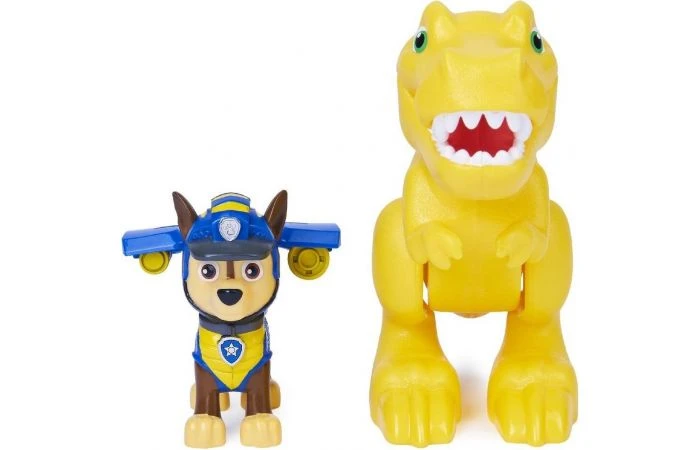 PAW Patrol gaat terug naar de prehistorie. Ga met je favoriete pups en nieuwe vrienden op spannende dinoreddingsmissies met de Dino Rescue Pup- en Dino-sets. Deze actiefigurenset bevat Chase, een grote T. rex en een verrassingsdinofiguur. De geliefde pup van de PAW Patrol draagt zijn Dino Rescue-reddingsuniform en is klaar voor actie. Druk op de badgeknop van Chase om het gereedschap op zijn rugzak uit te klappen. Duw vervolgens tegen de staart van de T. rex om zijn bek te openen. Open de verpakking en kijk welke kleurrijke dinosaurus jij krijgt voor al je reddingsavonturen. Met drie geweldige figuren brengt deze set al het prehistorische plezier van de populaire tv-serie tot leven. Verzamel alle Dino Rescue Pup- en Dino-sets (afzonderlijk verkocht) om telkens weer je eigen reddingsmissies te maken. Met Chase en zijn T. rex kun je urenlang je eigen avonturen beleven.
