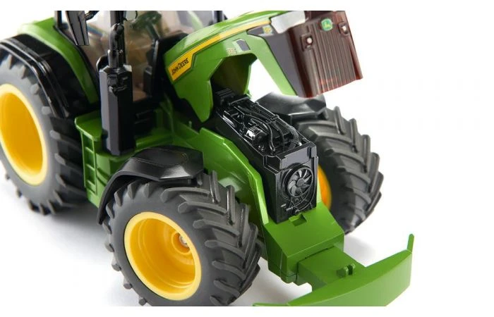 Krachtige tractor met het springende hert – De John Deere 8R 370 is een krachtpatser op het veld en een trekker voor comfortabel transport over de weg. De grote tractor weet door de vele details ook te overtuigen op een schaal van 1:32. Nu kan ook de frontkoppeling worden afgenomen en zeer eenvoudig worden vervangen door het meegeleverde frontgewicht. Dit biedt naast de functies van de koppeling achter nog meer speelmogelijkheden. De tractor kan met het stuurwiel worden bestuurd, hiervoor kan de cabine eenvoudig worden afgenomen. De kap vóór kan worden geopend en geeft zicht op de krachtige 6-cilinder.