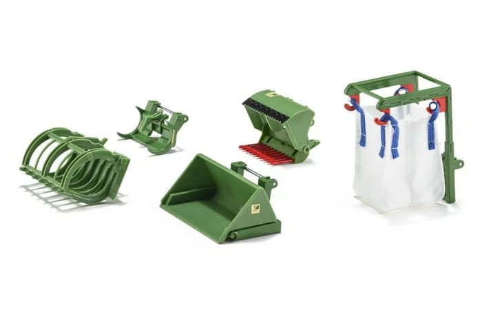 Zo levendig kan de modelwereld van Farmer32 zijn: Naar het voorbeeld van Bressel & Lade presenteert SIKU aanvullende accessoires voor de voorlader, die geschikt zijn voor alle 1:32-tractoren van SIKU Farmer met het voorlader-wisselsysteem. De set bevat een hoogkiepbak, mestgrijper, silagesnijder, maar ook een houtgrijper en Big-Bag-drager inclusief bijbehorende Big Bag. Daarmee kunnen gevarieerde scènes in de agrarische modelwereld realistisch worden afgebeeld – een opwaardering voor de speelbreedte van alle trekkers! Daarbij zorgt de Big-Bag voor een aha-effect, want hij is gemaakt van stoffen materiaal getrouw naar het origineel met kleurig afgezette lussen om op te hangen aan het hijstoestel en daarmee maakt hij eens te meer een realistische indruk. Alle accessoires kunnen volledig functioneren en worden gemaakt naar hun grote voorbeeld van de combinatie van kunststof met metalen onderdelen. (Aanwijzing: De set kan niet worden gecombineerd met de SIKU Control John Deere met voorlader, art.nr. 6777).