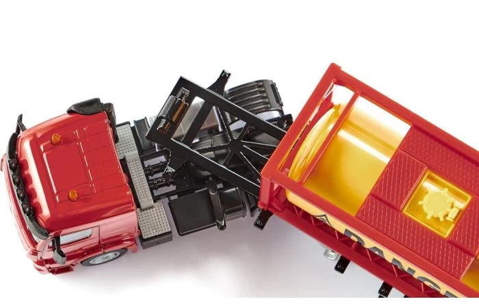 Vloeibare grondstoffen en gassen worden wereldwijd verhandeld, verwerkt en in tankcontainers vervoerd. Op een vrachtboot, via het spoor of gewoon over de weg. Daar neemt de nieuwe SIKU SUPER50 Mercedes-Benz Arocs met een drie-assige oplegger het transport voor zijn rekening. De container is in een frame bevestigd en kan net als bij het origineel worden afgeladen en opgestapeld. De kleppen van de vulopeningen kunnen worden geopend en de tank kan met water worden gevuld. Het chassis van de oplegger kan worden verlengd zodat er twee containers kunnen worden vervoerd. Ook de kop biedt een indrukwekkende functie. De chauffeurscabine kan naar voren worden gekanteld om zicht te geven op de Dieselmotor. Vanzelfsprekend kunnen de containers van de SIKU vrachtwagen met containers (3921) worden vervoerd.