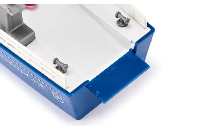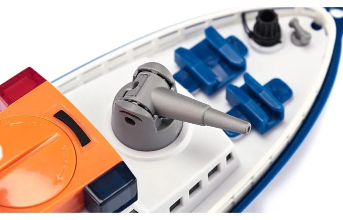 De politieboot schiet op volle kracht door het water en achtervolgt een snelle motorboot. De politie zit achter een paar smokkelaars aan, schakelen de blauw/rood knipperende LED-signaallichten en de elektrische sirene in. De smokkelaars draaien niet bij, ze proberen uit de territoriale wateren te vluchten. De agenten rest nog maar één mogelijkheid: de smokkelboot stoppen met het waterkanon! Water aan! Er kan water in het kanon worden gevuld en met de stop wordt vervolgens de druk opgebouwd. De boot wordt met het waterkanon geraakt, de agenten hangen de boot met een lijn van de lier aan de politieboot. Aan de achterkant wordt een klep geopend en de boot wordt aan boord getrokken. Missie geslaagd: de smokkelaas zijn gearresteerd. De nieuwe SIKUWORLD politieboot kan drijven en kan met behulp van een adapter met de gangbare motoren van ander systeemspeelgoed worden aangedreven. Als accessoire wordt bovendien een grote boei meegeleverd wanneer de boot voor anker gaat.
