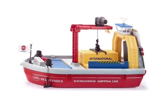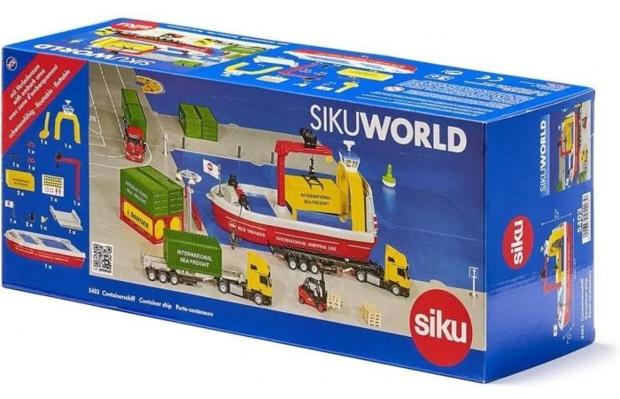 In de haven wordt het drijvende containerschip met de twee mechanische ankerlieren verankerd. Net als het grote voorbeeld kunnen de beide bunkers in de romp van het schip worden geladen met stortgoed (granulaat of zand) of de twee containers. Op het dek van het containerschip kunnen echter ook auto’s of vrachtwagens worden vervoerd. Deze kunnen daarvoor via de achtersteven in de beide bunkers rijden. De containers kunnen met de draaibare kraan, de bewegende loopkat en een speciale grijper heen en weer worden bewogen. Vanzelfsprekend passen deze op de SIKU opleggers op schaal 1:50 die aan de kade staan te wachten. De meegeleverde schop kan bij het uitladen worden gebruikt.