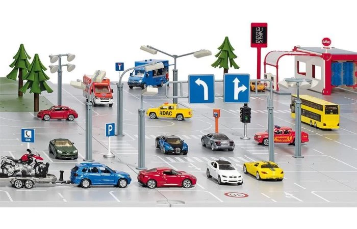 Aanvullende set voor SIKUWORLD met straatlantaarns, parkeer- en bouwplaatsverlichting evenals diverse verkeersborden.