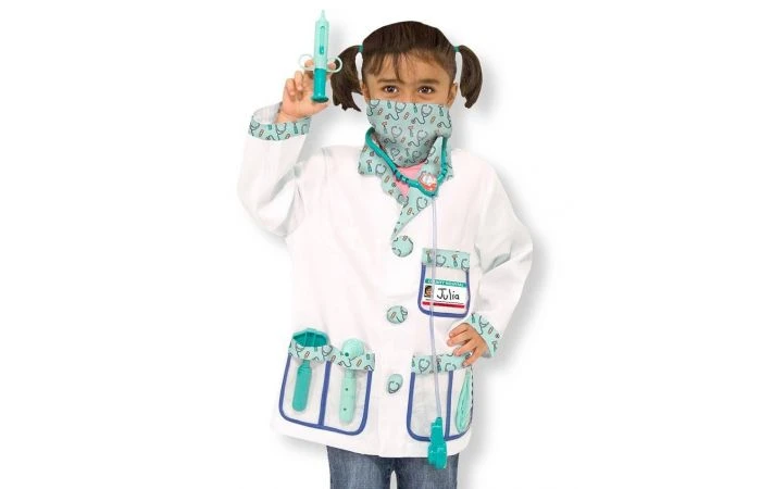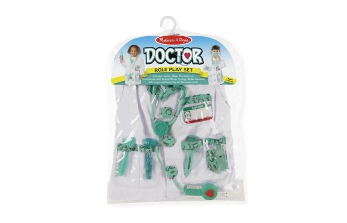 Inhoud: dokterjas, mondkapje, thermometer, stethoscoop met geluidseffect, spuit, reflexhamer, otoscoop en herbruikbare naamlabel