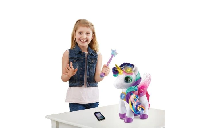 Gebruik de toverstaf en kies een kleur voor Styla’s ogen, bloem, hoorn, manen of vleugels! Blaas een kusje naar haar bloem en zie deze bloeien en oplichten in mooie kleuren. Druk op de knipperende amulet of raak haar neus aan voor leuke activiteiten en zie haar vleugels op magische wijze bewegen! Verander de stijl van haar eenhorn-manen en voeg leuke haarclipjes toe! Wordt inclusief 2 AA-batterijen geleverd in try-me verpakking. Geschikt voor kinderen vanaf 4 jaar.